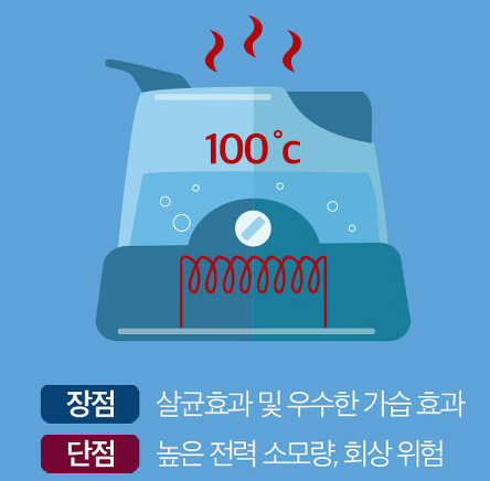 하지만, 물을 끓여야 하기 때문에 열을 발생시키기 위해 전력 소비가 많은 편이며, 열원에 의한 화상위험이 있어 유아나 반려동물이 있는 곳에서의 사용은 적합하지 않습니다.